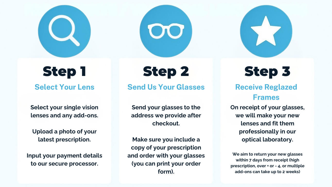 Thank you for submitting your order for reglazing.We will now await your glasses/frames.We aim to have your new glasses with you within 7 days from receipt (please allow up to 14 days if you have over a + or - 4 prescription or have multiple add-ons).